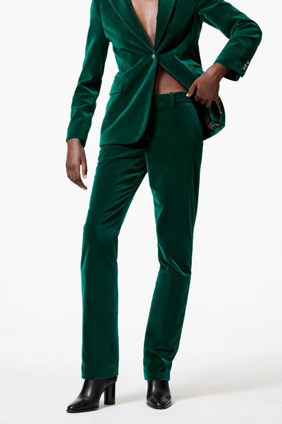 Straight Fit Velvet Trousers - Green Zara United Kingdom